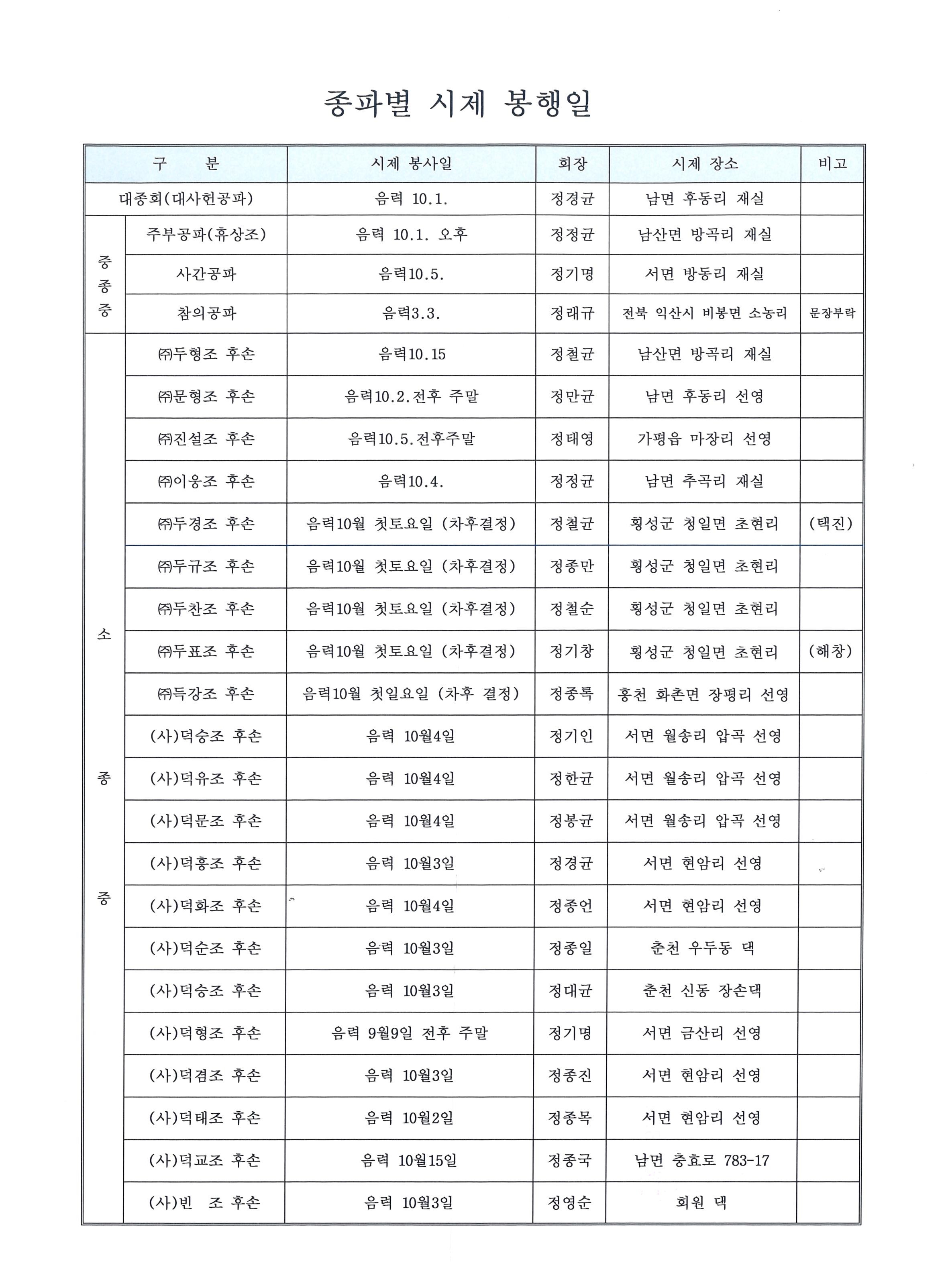 2023년 종파별 시제 봉행일 및 장소