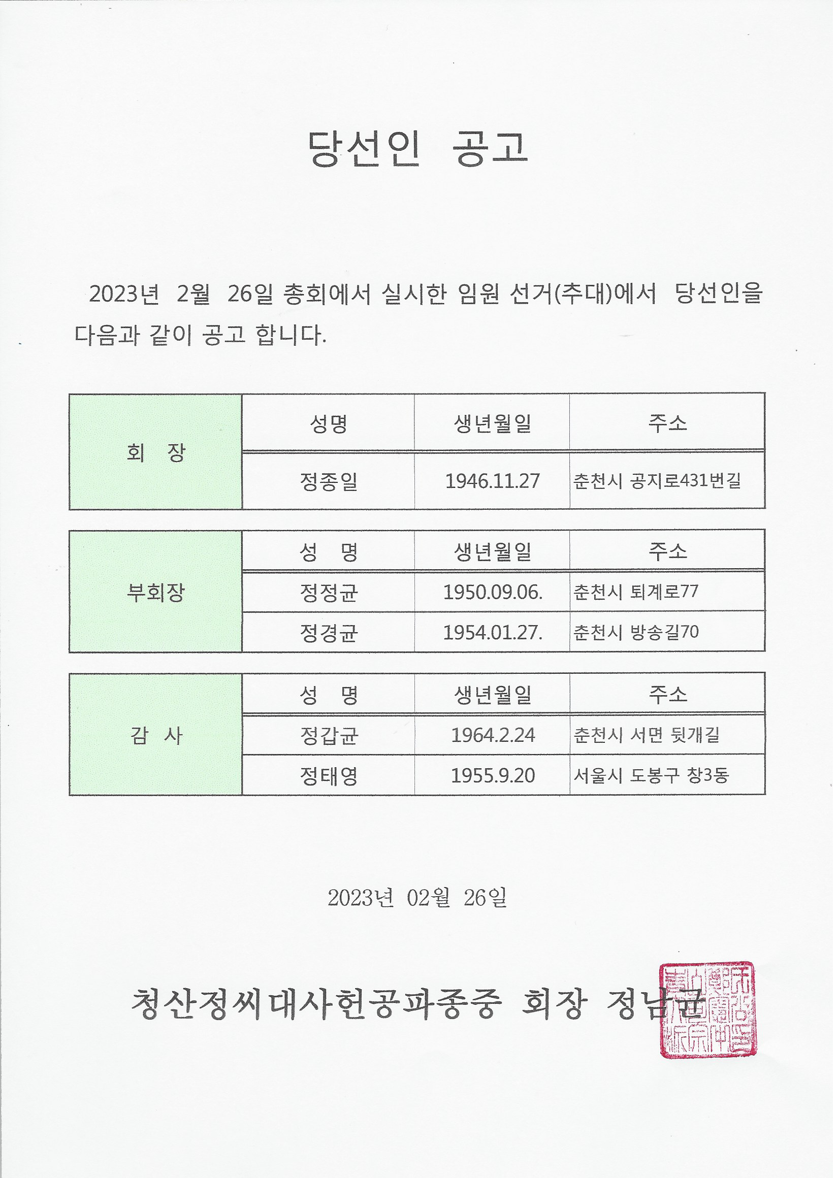 2023년 임원선거(추대) 결과 공고