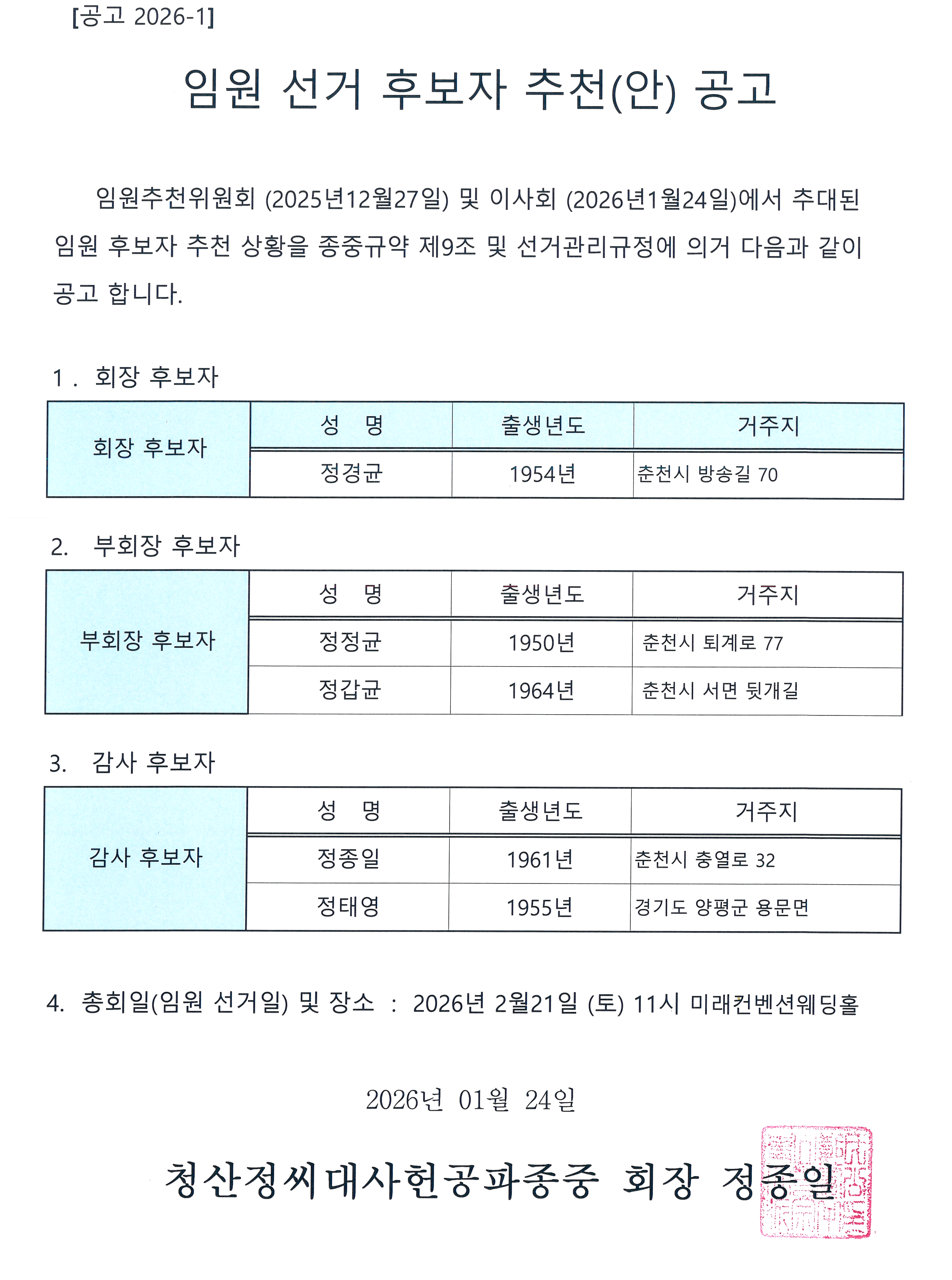 임원 선거 후보자 추천(안) 공고