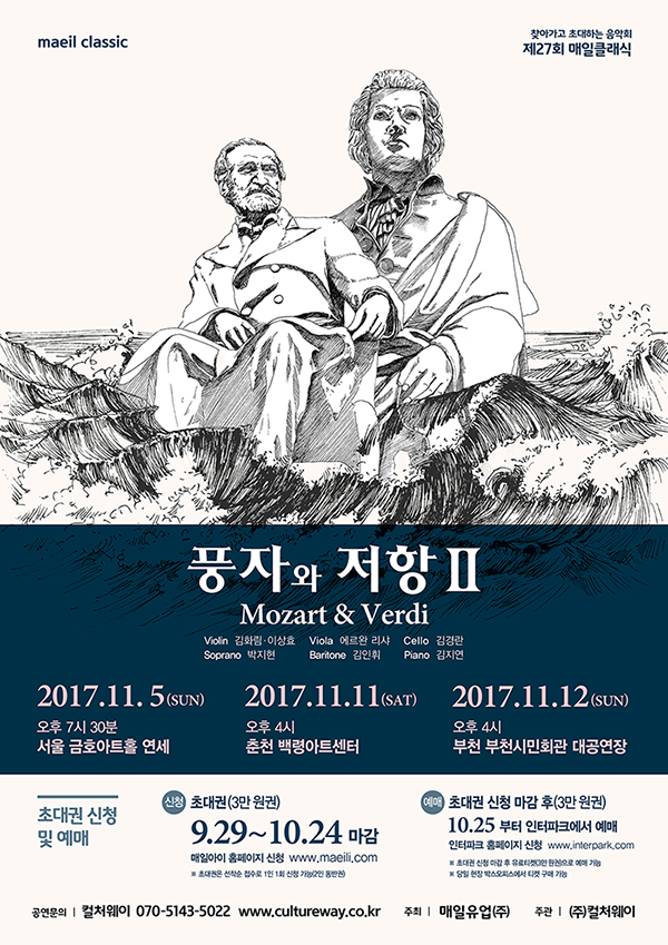 청산정씨 분들을 클래식 공연에 초대합니다. 지난 14년간 매일유업에서 기업의 이익을 사회에 환원한다는 취지로 진행해온 매일클래식이 이번엔 강원도 춘천 백령아트홀(강원대)에서 열리게 되었습니다. 청산정씨 18세대인 제가 이 공연의 디자인 책임을 맡아 강원도에 살고 계시는 청산정씨 분들을 초대하고 싶습니다. 티켓은 3만원 상당이나 공연관람을 원하시는 청산정씨 분들께는 아래 번호로 전화주시면 특별히 무료로 보내드리도록 하겠습니다. 공연문의 02-569-5719 크리에이티브야드